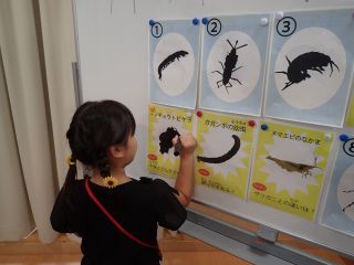机に一つづつたくさんの生きものが入ったトレーが配られ、ホワイトボードに貼ってある生き物のシルエットをさがします。