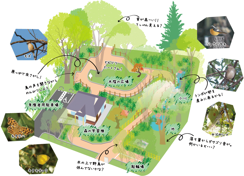 樹木の上では野鳥が木の実を食べ、足元にはたくさんの昆虫たちが暮らし、